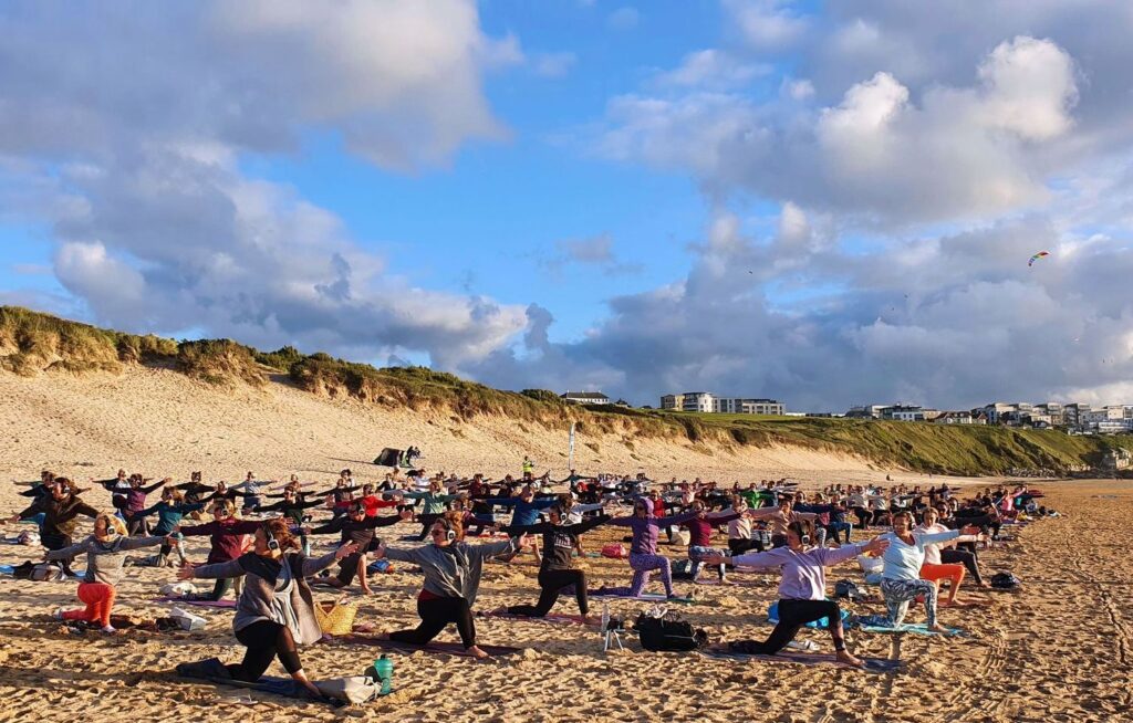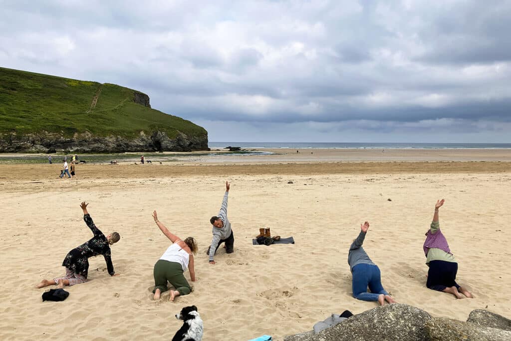 Beach yoga on Mawgan Porth beach with Mawgan Pause.