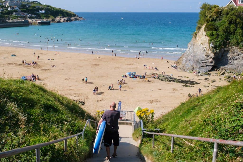 Towan Beach is a delightful sandy beach nestled right in the heart of Newquay, Cornwall. This picturesque cove is overlooked by the iconic Towan Island, connected to the mainland by a suspension footbridge. The beach’s sheltered position makes it popular with families and beginner surfers alike. Dogs are welcome year-round, and lifeguards patrol during the summer months to ensure visitors’ safety. While there are no facilities directly on the beach, toilets and refreshments can be found just a short walk away in town, plus there are seasonal cafes and take aways on the promenade abobve the beach.