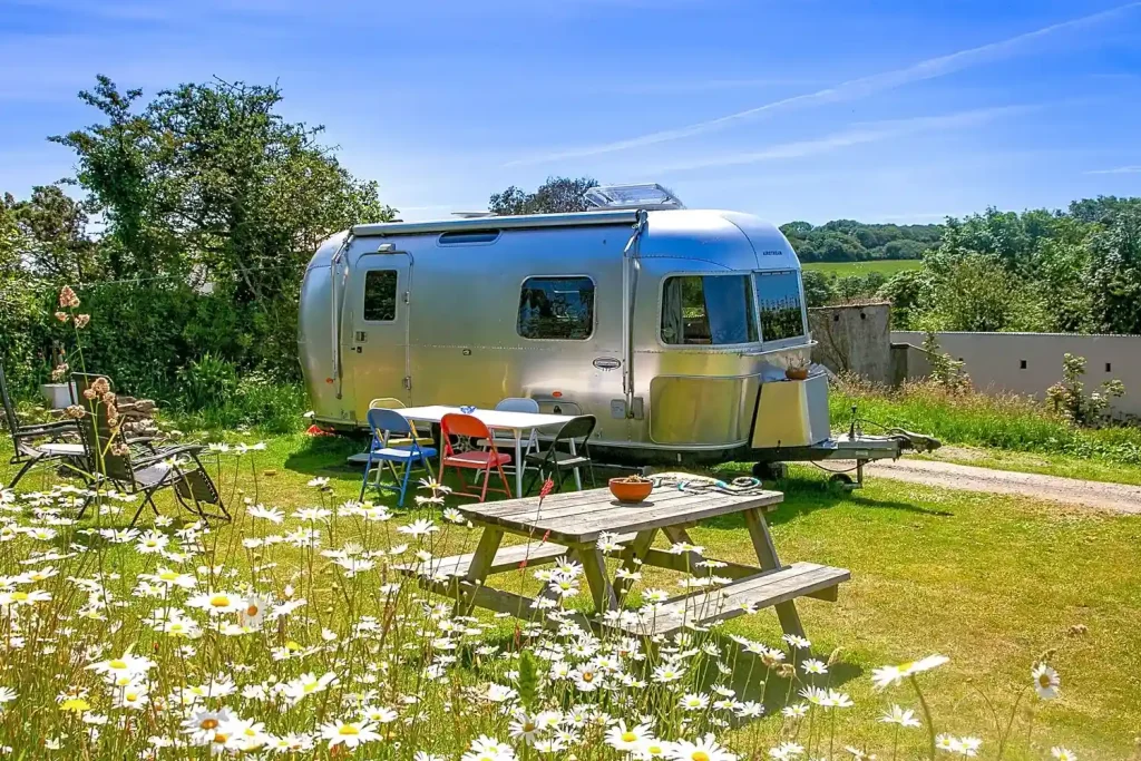Wheal Busy Holidays offers a luxurious glamping experience in the heart of Cornwall, just a stone’s throw from beautiful beaches like Perranporth. The site is dotted with bell tents and a vintage Tinner Airstream, each equipped with comfortable beds, fire pits, and al fresco dining areas. Guests can enjoy serene evenings by the campfire or simply take in the breathtaking views over the historic tin mines. The peaceful setting is perfect for families and dog owners alike, providing a tranquil retreat amidst nature’s splendor.